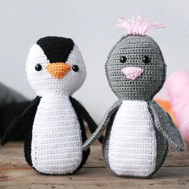 One sports the traditional black and white look with an orange beak, while the other has a playful gray body, pink accents, and a tuft of yarn “feathers” on top.
