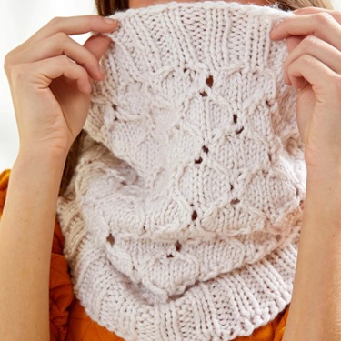 This lace knit cowl blends soft texture with airy eyelets, creating a lightweight loop that still feels wonderfully cozy.