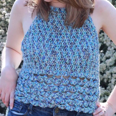 The Quick Crochet Halter Crop is a simple yet stylish design worked in variegated yarn with shades of green, blue, and lavender that create a natural, earthy vibe.