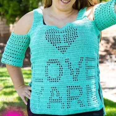 Featuring a heart and the words “LOVE YARN” in filet crochet, this top is as fun to make as it is to wear.