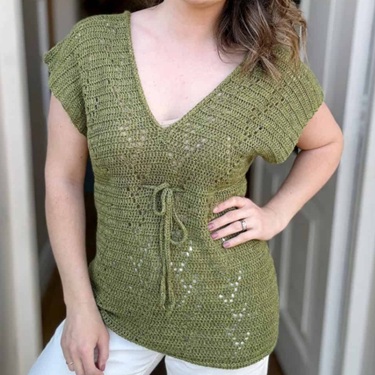 The Diamond V-Neck Top is a stylish and breezy crochet garment featuring a stunning filet diamond motif and a flattering neckline.