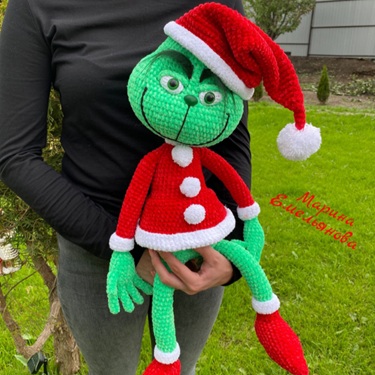 Made using plush, velvety yarn, the finished Grinch is large, cuddly, and full of character—from his sly smile to his festive hat and striped scarf.