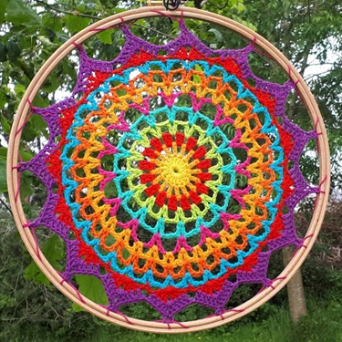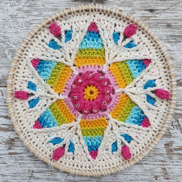 Perfect as a wall hanging, table decoration, or simply as a fun stash-busting project, this mandala is a bright reminder of creativity and happiness in yarn form.