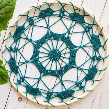 The Lace Mandala is a delicate and airy crochet design with an elegant spiderweb-like structure radiating from a solid circular center.