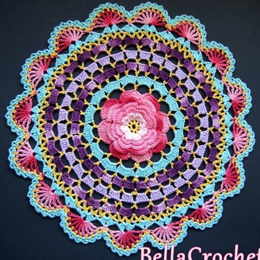 The Radiant Rose Mandala Doily features a beautifully layered rose at its center, surrounded by delicate lacy rounds in vibrant, contrasting shades.