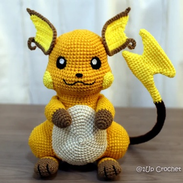 This adorable Raichu amigurumi shines with its bright orange body, creamy spiral belly, big round ears, and lightning-bolt tail.