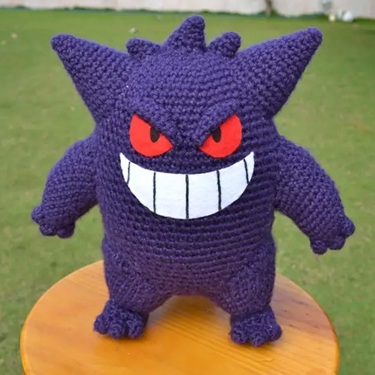 These mischievous Gengar amigurumi Pokémon crochet patterns feature a plump purple body, spiky back, and that signature wide grin with bold red eyes—perfectly spooky-cute!